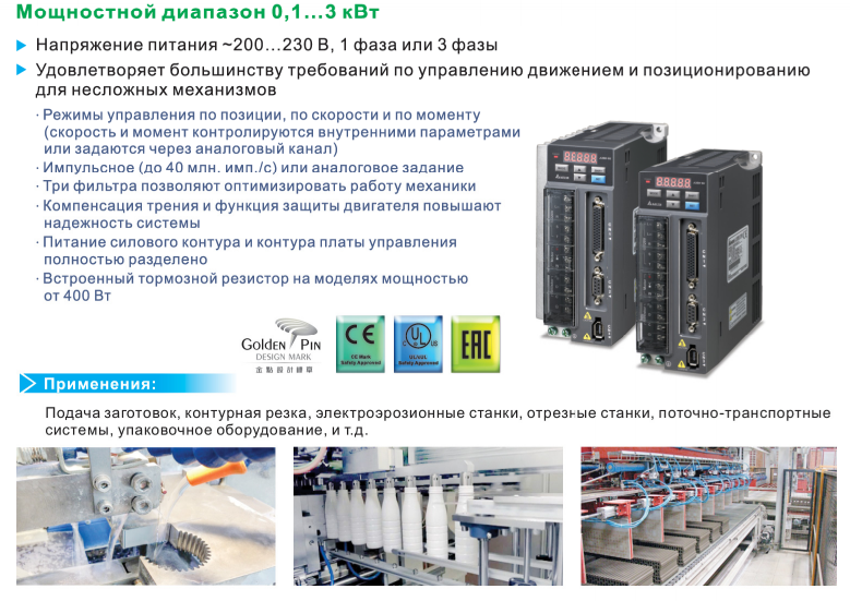 - Три режима управления: положением, скоростью, моментом. Режим позиционирования осуществляется только по внешнему импульсному сигналу задания, а режимы скорости и момента - как по внутренним параметрам, так и по аналоговым сигналам задания.