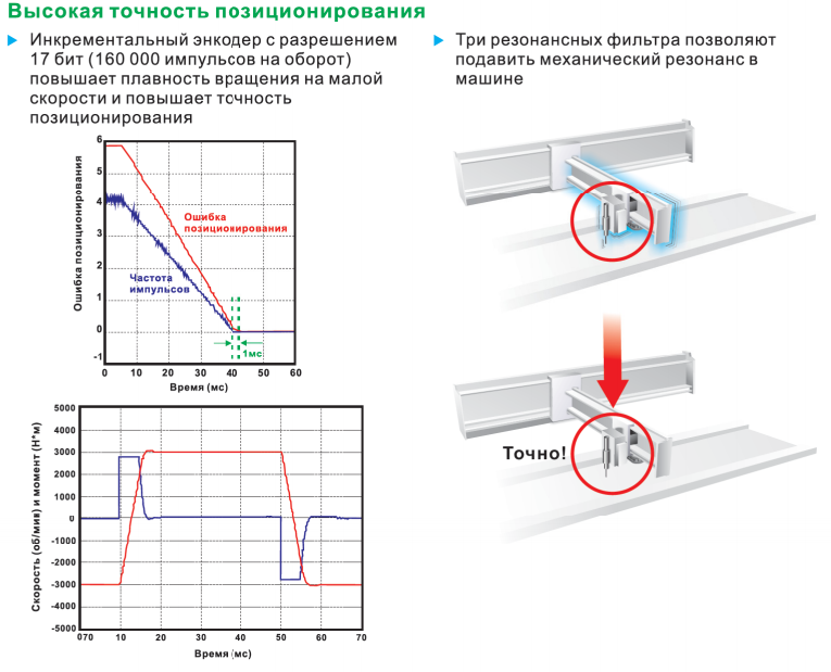 - Повышенная точность. Встроенный энкодер на 131 072 имп/об (17 бит), что удовлетворяет широкому кругу применений сервопривода, и гарантирует стабильную работу на низких скоростях. Импульсный вход с частотой до 4Мгц.