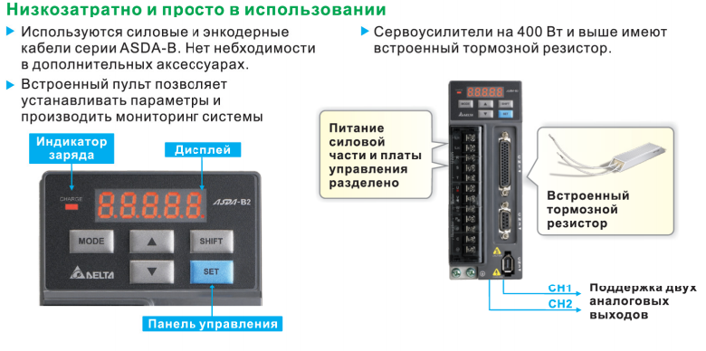 - Встроенный цифровой пульт управления. Позволяет быстро сконфигурировать и оперативно вести мониторинг за работой сервопривода.